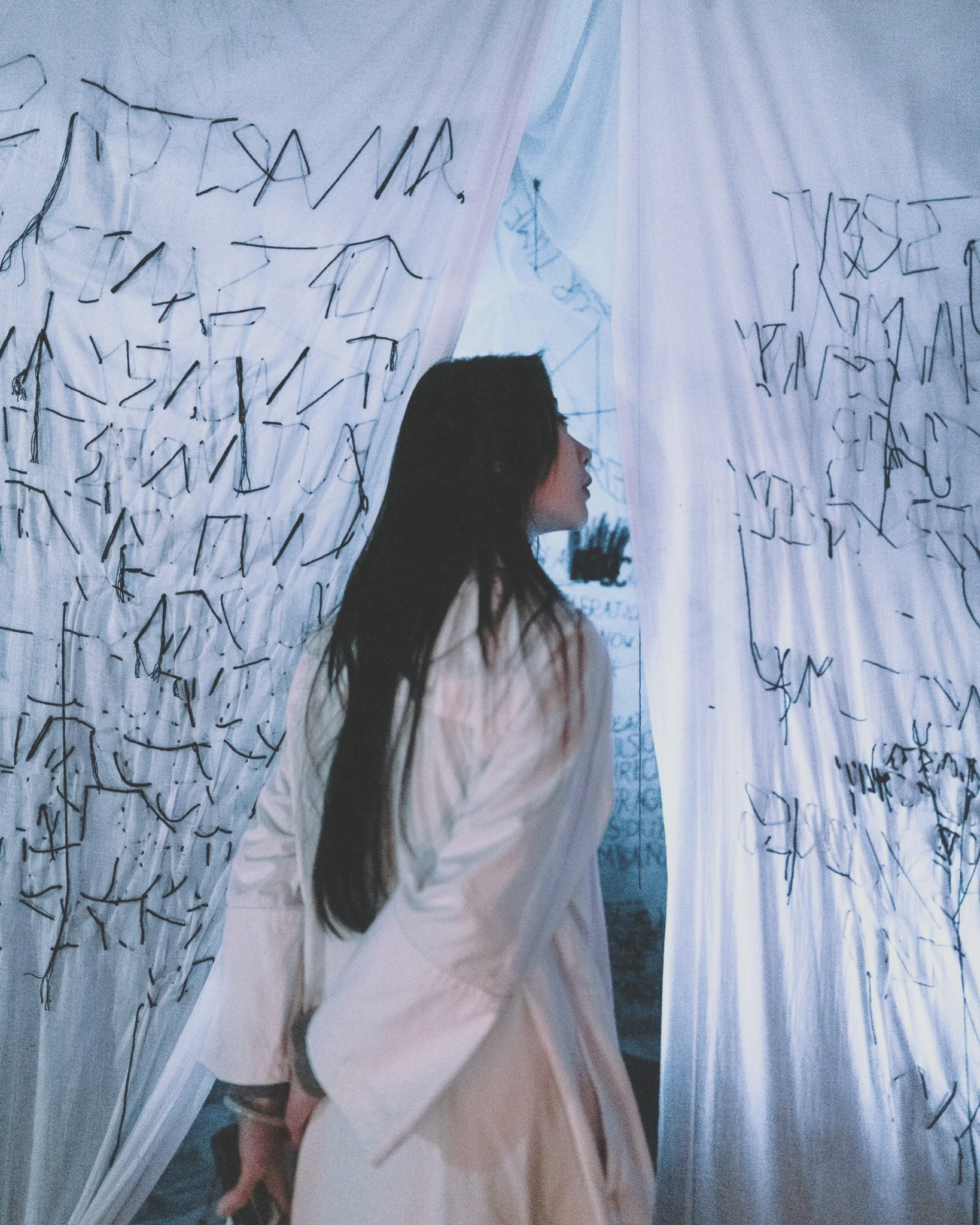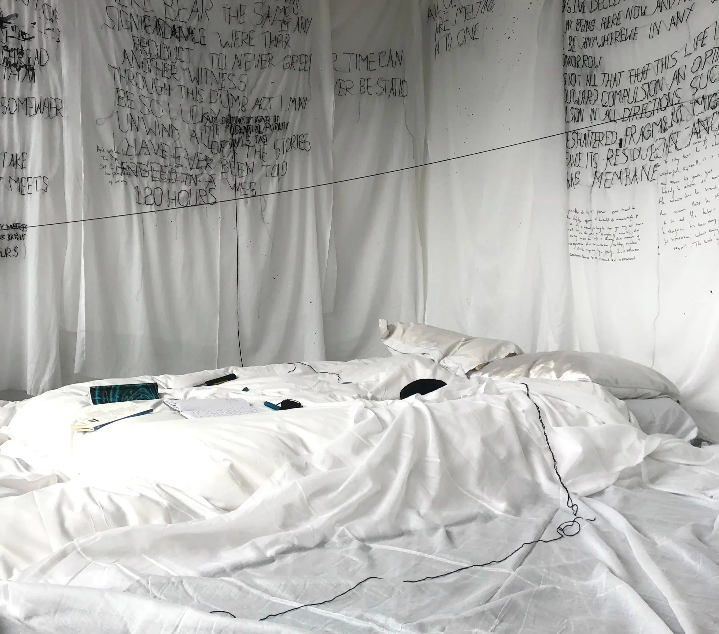 Over the course of five days, I stayed locked inside a warehouse with no clocks, phone, laptop, or contact. The room was covered in about 50m of white muslin, into which I hand stitched my thoughts.