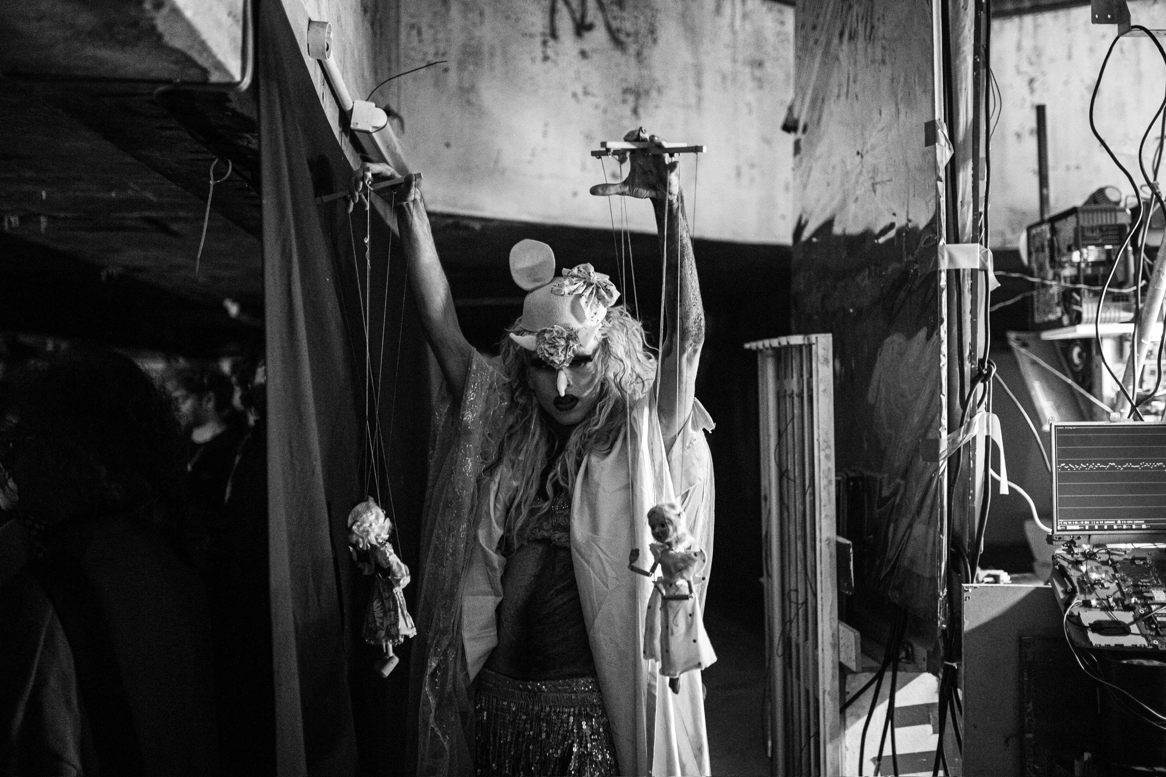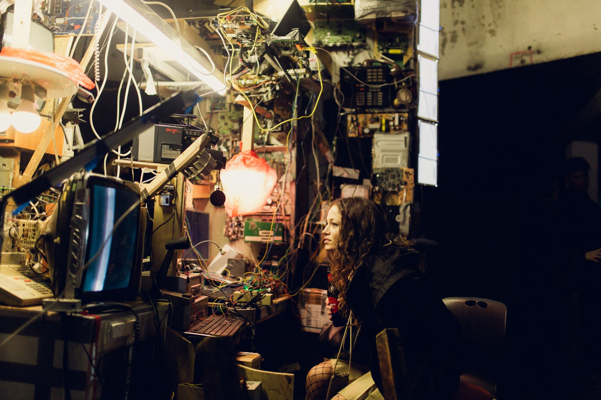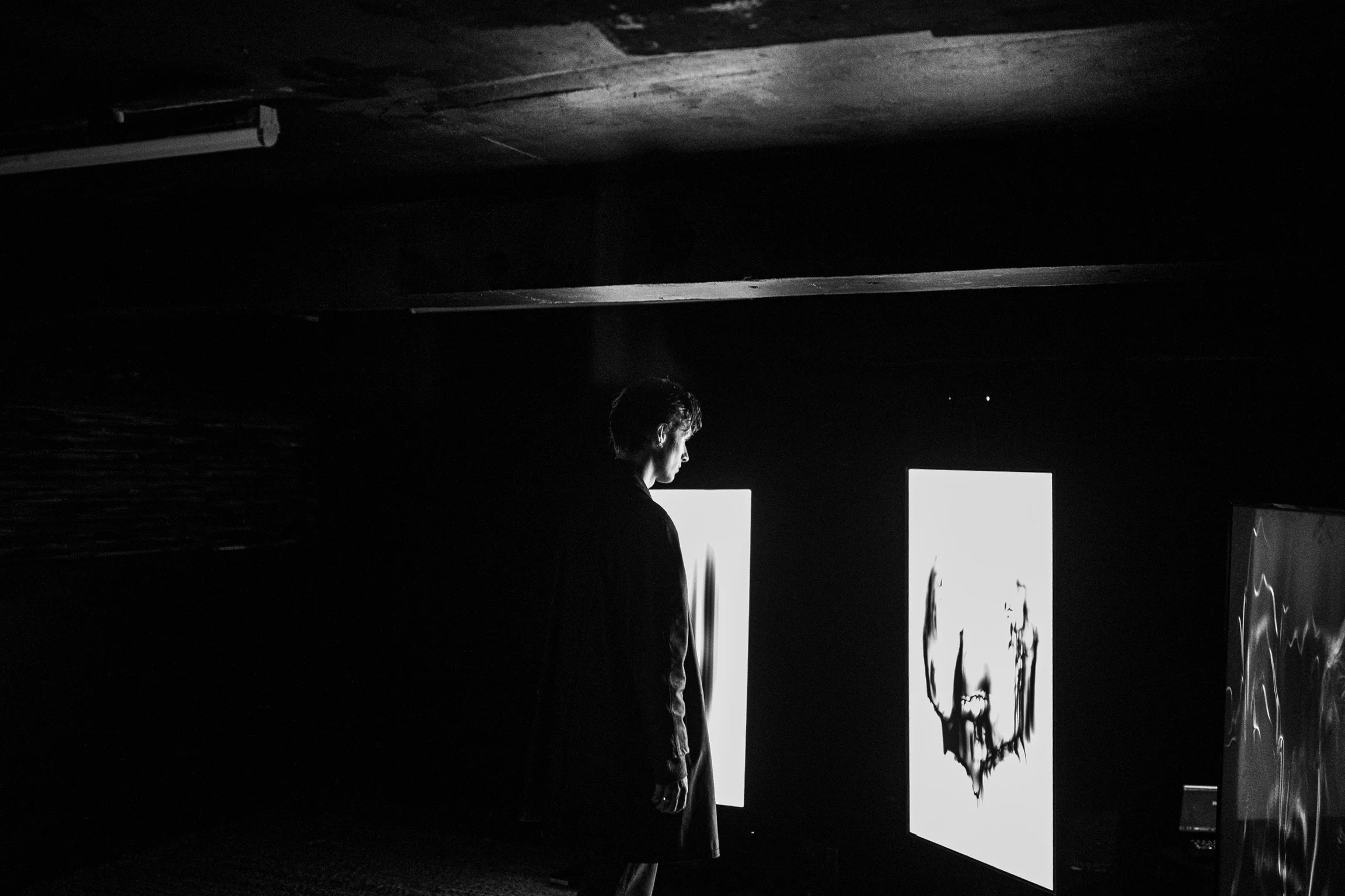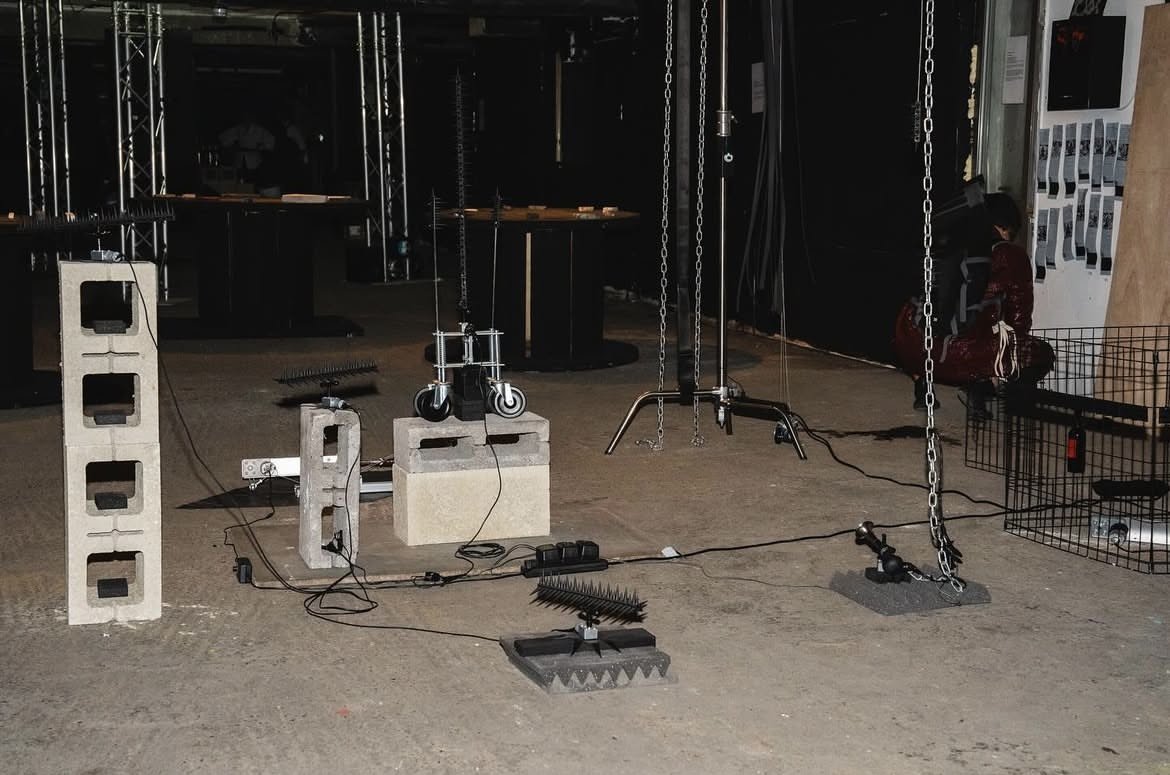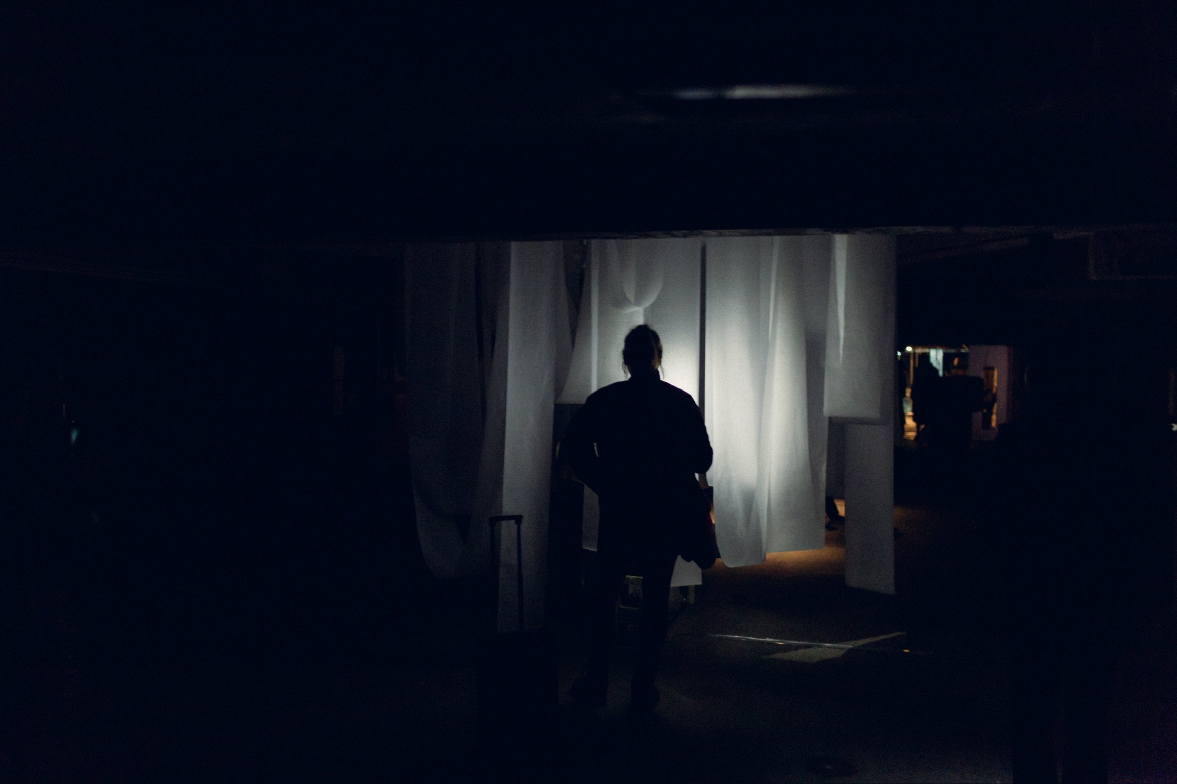 Installing the show involved emptying the warehouse (which was being used as a storage unit), painting the entire venue black, and wiring multiple very large scale and technologically complex works, whilst managing and directing all installations and performance rehearsals. This was done across two days